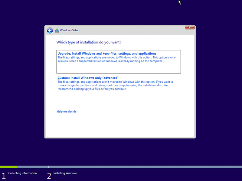 Step 5: Next, you’ll be presented with this screen, where you can choose to do either an upgrade (files, settings, and apps are moved to Windows) or a custom install (files, settings, and apps aren’t moved). The latter is the one to choose if you prefer a clean install, which was what we did.