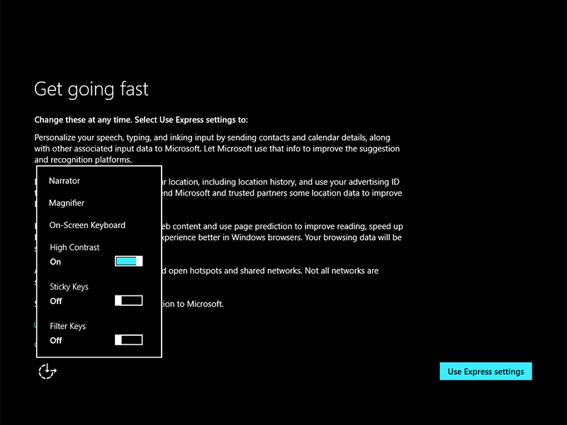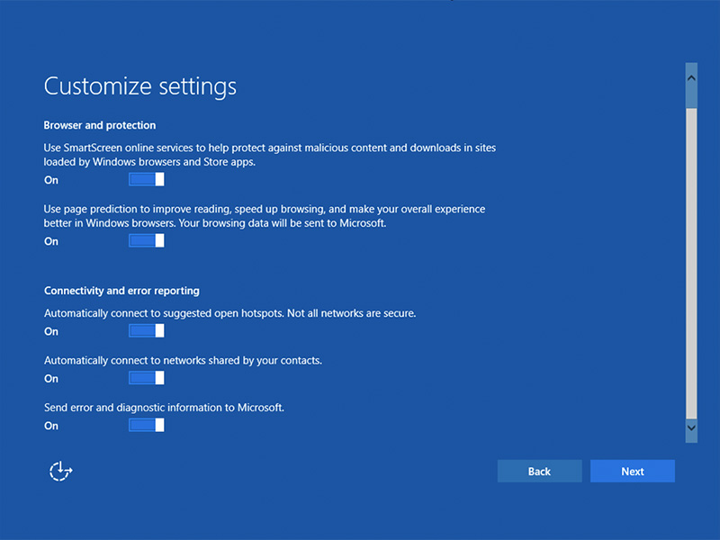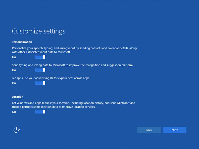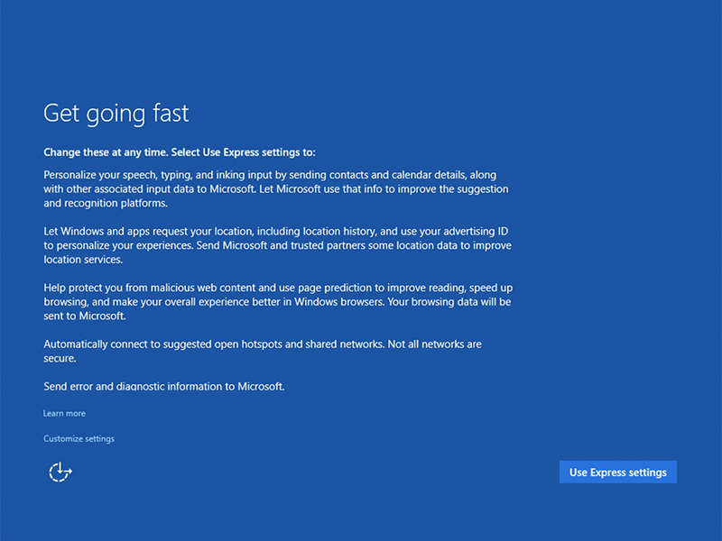 Step 8: Before you can start using Windows, there are some personalization, location, browser and protection, and connectivity and error reporting settings that you can adjust. You can zip through all these by using the Express settings, which basically turn everything on, or you can hit the small print that says ‘Customize settings’ to customize them. We went for the latter.