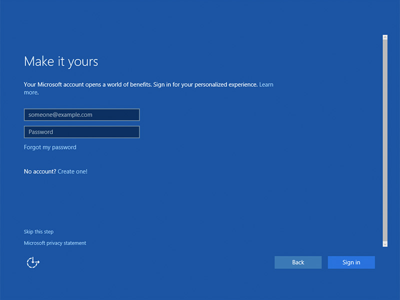 Step 12: Microsoft really wants you to sign in to Windows 10 with your Microsoft account. If you use Microsoft services like Office, Outlook.com, OneDrive, Skype, or Xbox, it makes sense to sign in with your Microsoft account as it ties them all up and makes your Windows experience more personal.