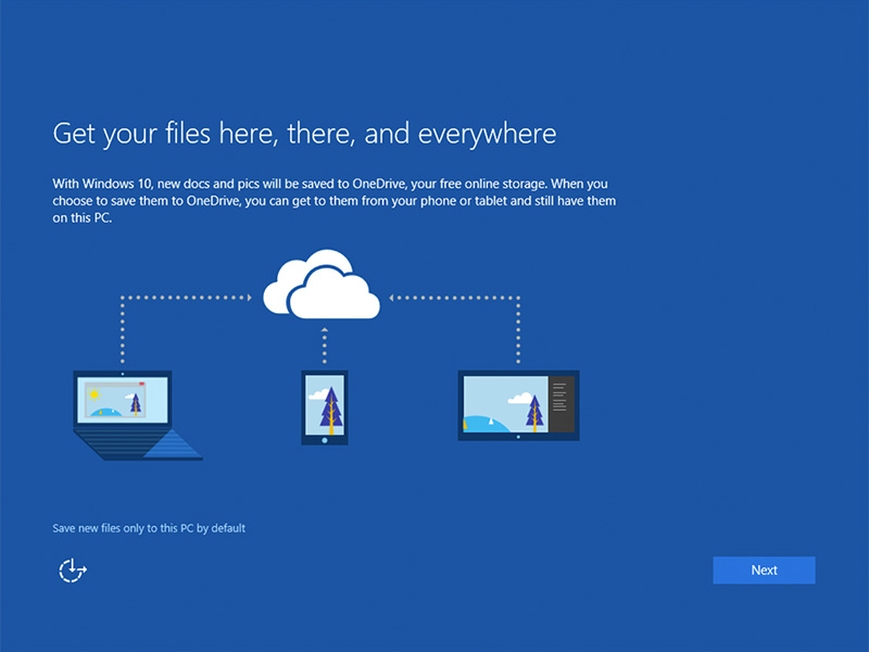Step 14: Windows 10 will save new documents and pictures to OneDrive. If you’re okay with that, just hit Next to continue. Else, you can click the small text that says ‘Save new files only to this PC by default’.