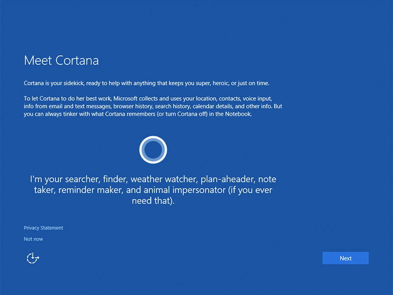 Step 15: You can also decide if you want to turn on the Cortana personal assistant feature. Some people may not want to use Cortana as this allows Microsoft to collect and use their location; contacts; voice input; info from email and messages; browser history; search history; calendar details; and more. If you were to ask us, Cortana is one of the best features in Windows 10. And for it to be truly useful, it has to be granted access to such data. Here’s a link to Microsoft’s privacy statement.