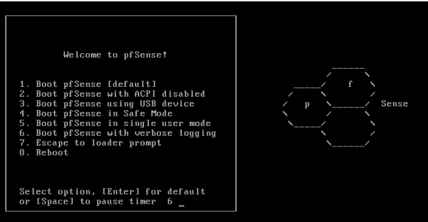 Step 5. As the pfSense starts booting, a prompt is displayed with some options and a countdown timer. At this prompt, press 1 to get install pfSense by default.