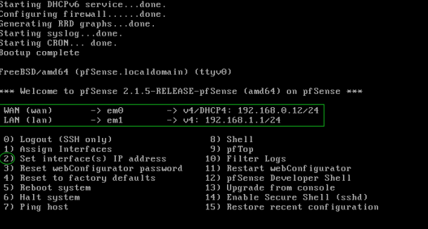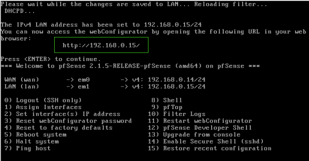 Step 15. After setting up interfaces, you will get the pfSense menu as show below