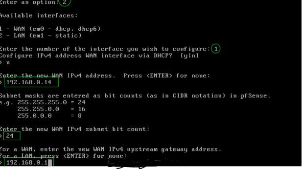 - LAN IP address will be default as 192.168.1.1, if you want to change choose option 2 and set interfaces IP address.