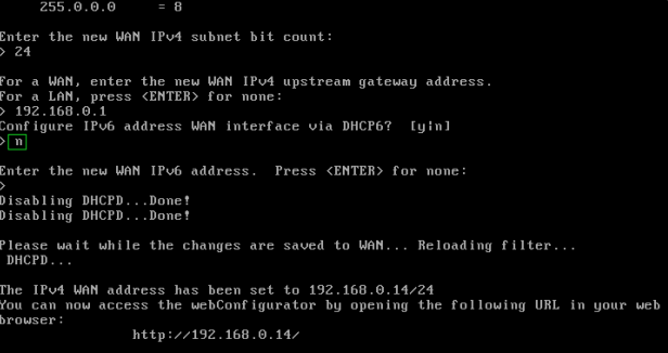 First let me define a Static IP, subnet mask in Bit count and gateway for the WAN and LAN. Disable the DHCP and continue by choosing Y