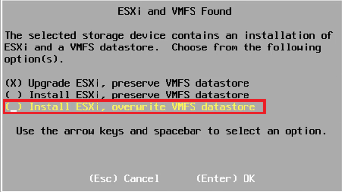 Install ESXI, Overwrite VMFS data store: