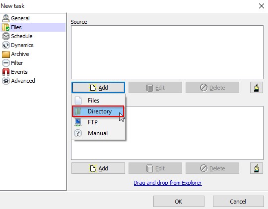Select the directory from the system to be backed up as the source.