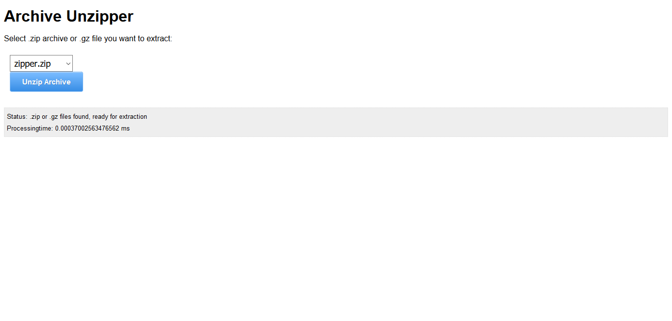 - You’ll see a select input box which contains a list of zipped files in the folder. You can select any file and click on unzip the archive.